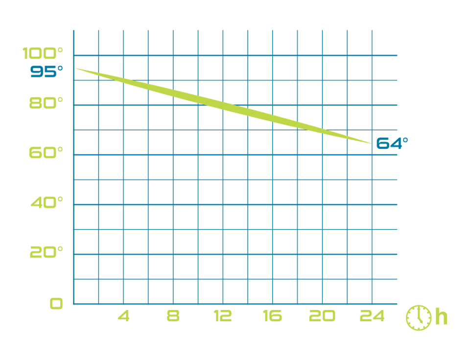 Po 24 hodinách vroucí nápoj o počáteční teplotě 95°C v termosce dosahuje teploty okolo 64°C za venkovních podmínek 18°C.